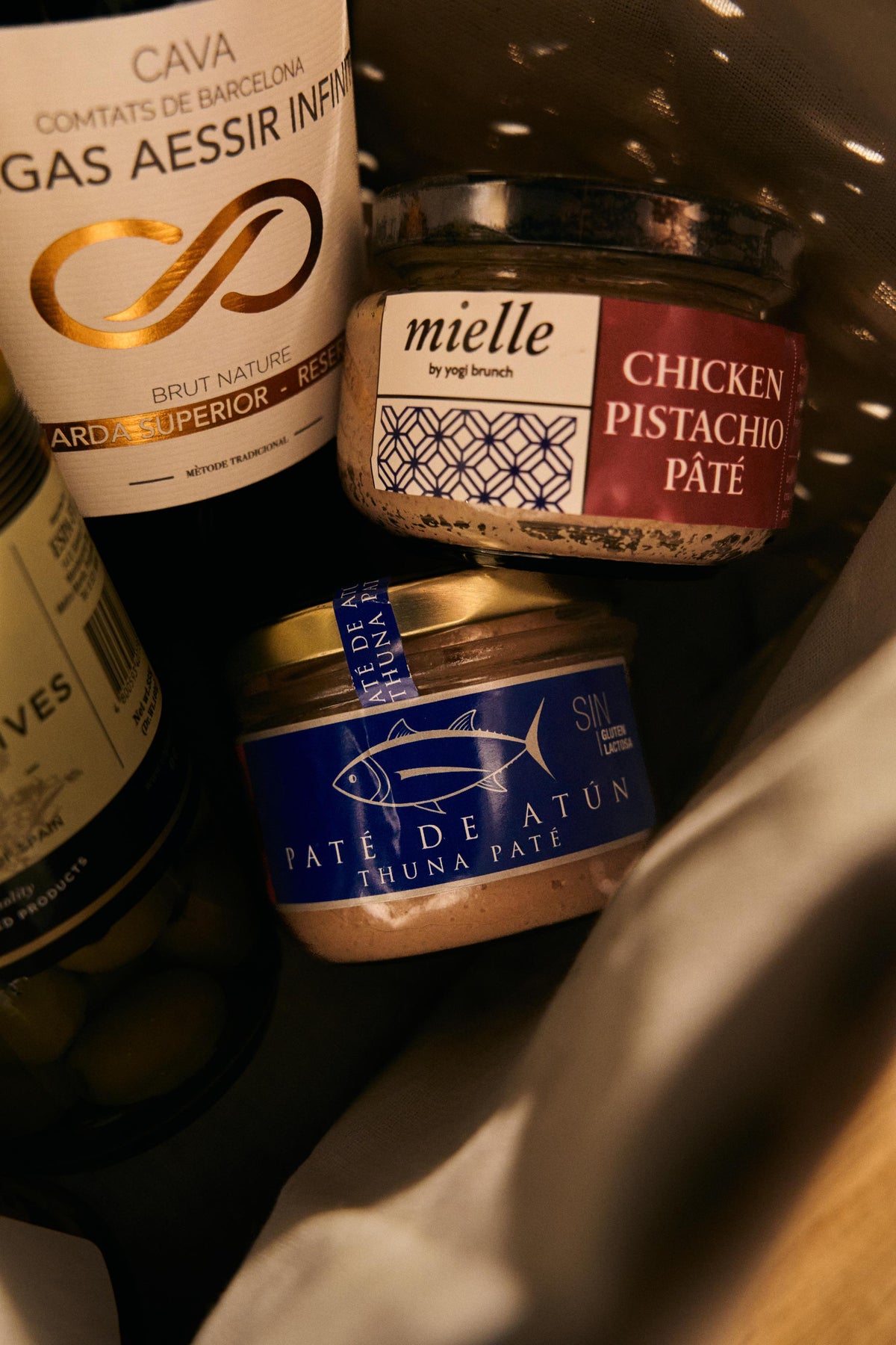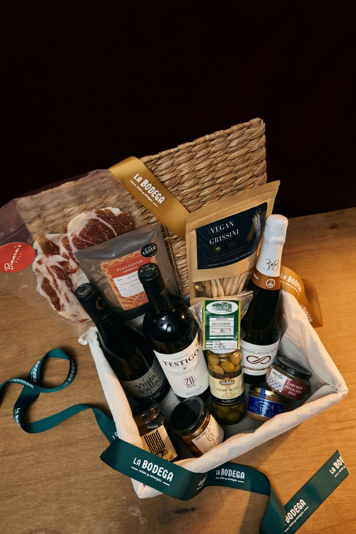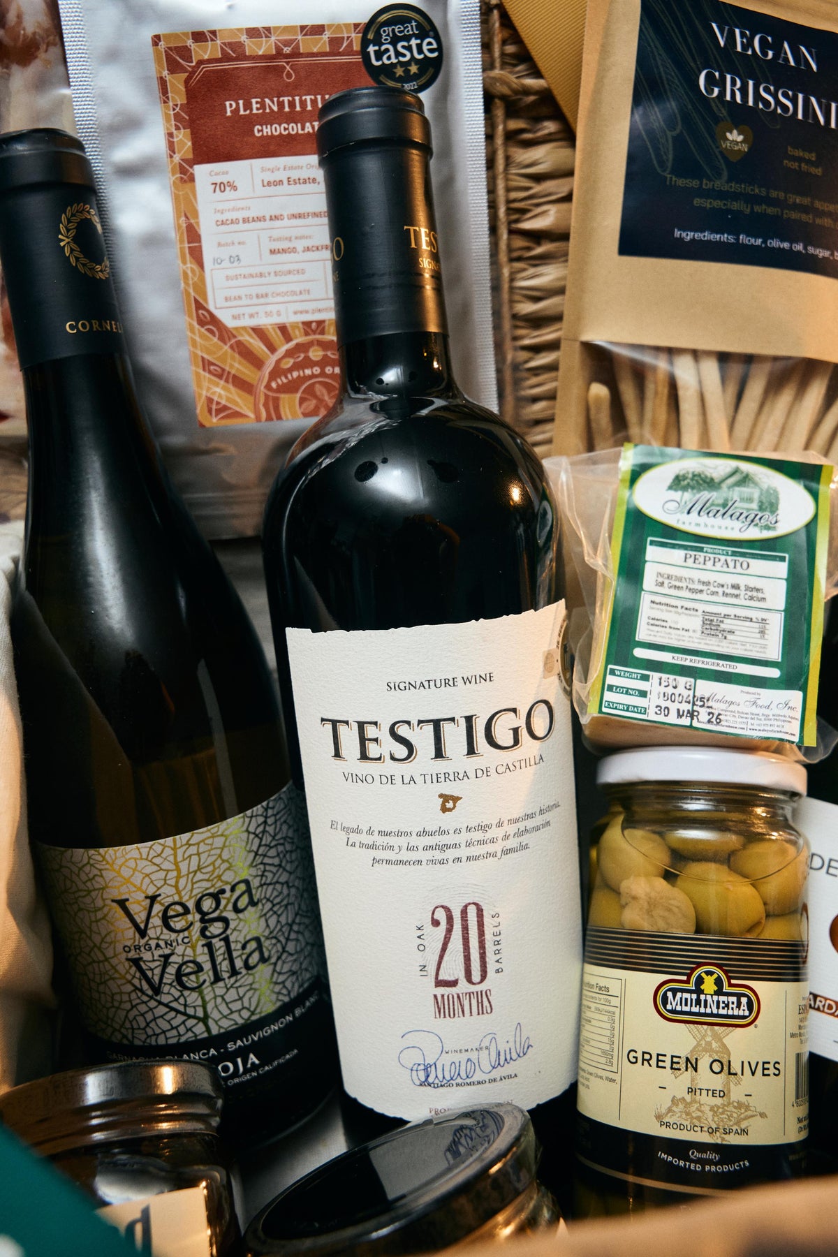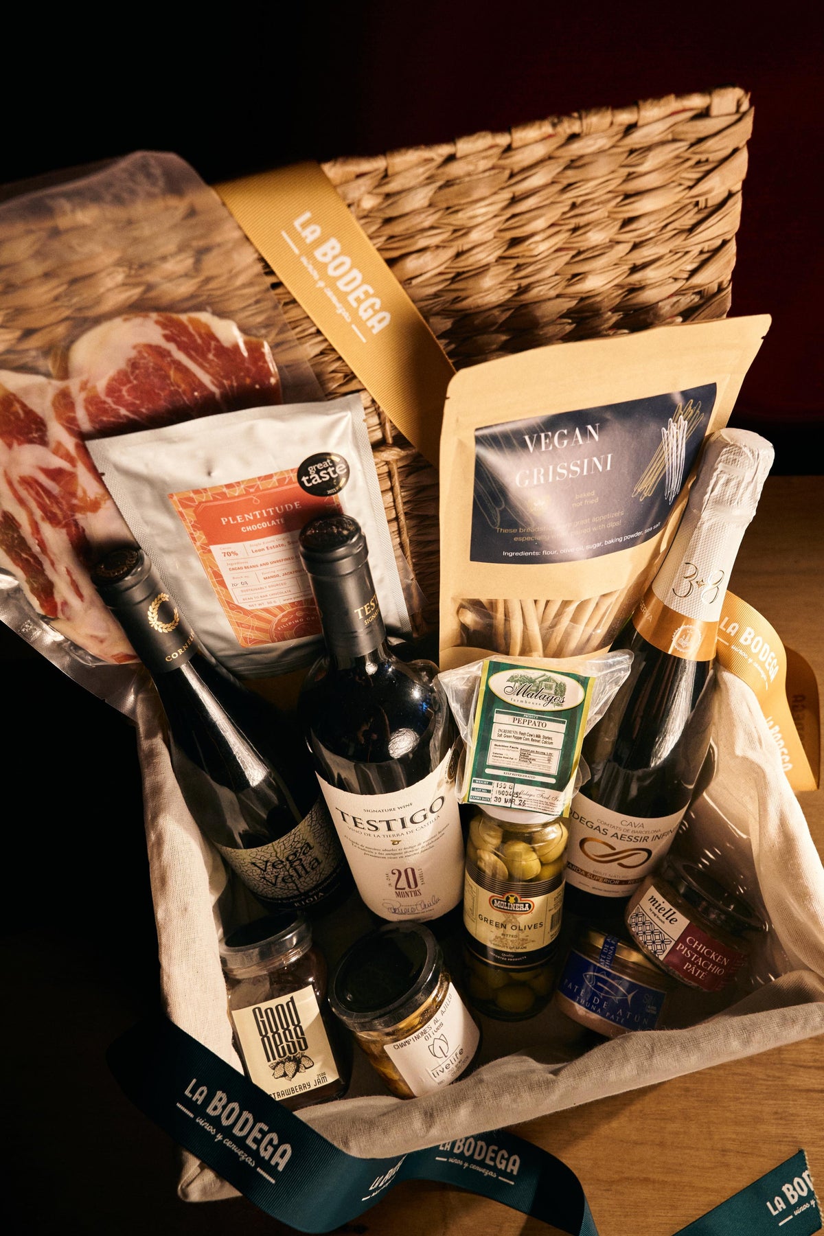 Set includes: Infinity Cava Brut Nature, Vega Vella Blanco, Testigo Autor 20mos, Jamon Brothers Jamon Serrano 100g, Malagos Peppato Cheese, Plentitude Leon Estate Bar, Coren Paté de Atún, Pitted Green Olives, Strawberry Jam, Champiñones al Ajillo with Olives, Chicken Pistachio Pate, Vegan Grissini