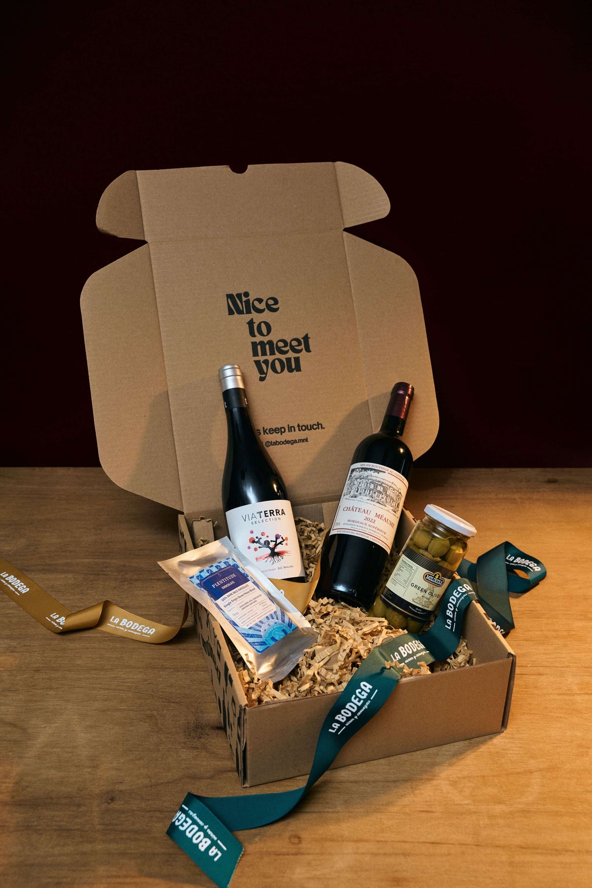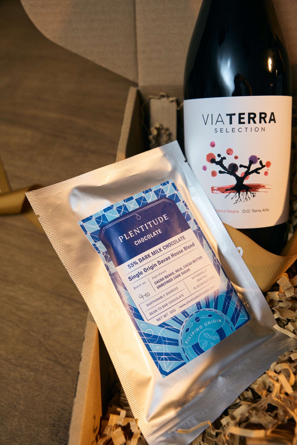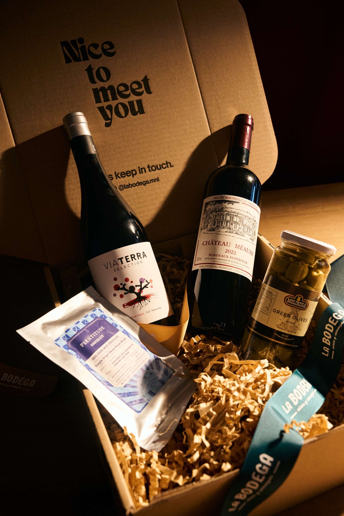 Set includes: Via Terra Negre, Château Méaume Bordeaux Supérieur, Plentitude Dark Chocolate Potato Chip Bar, Pitted Green Olives