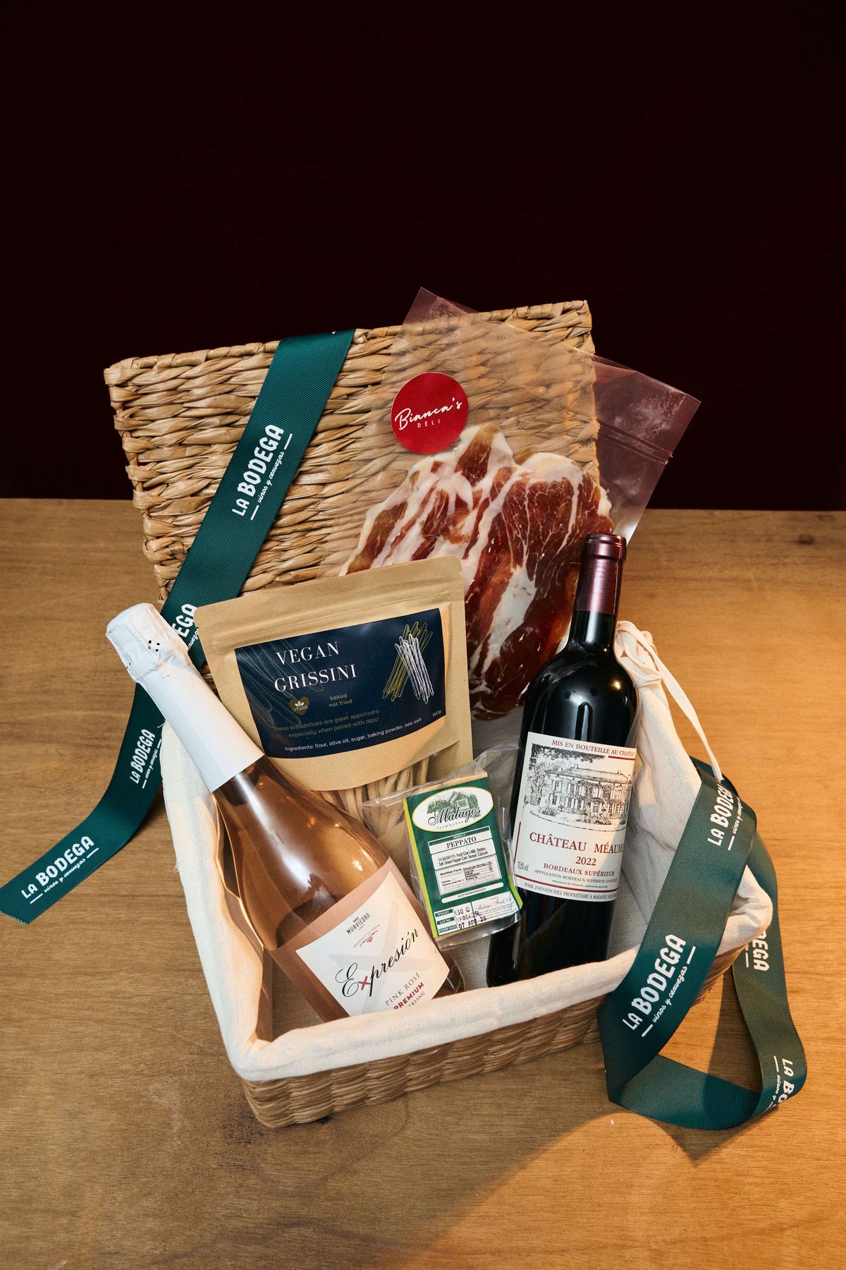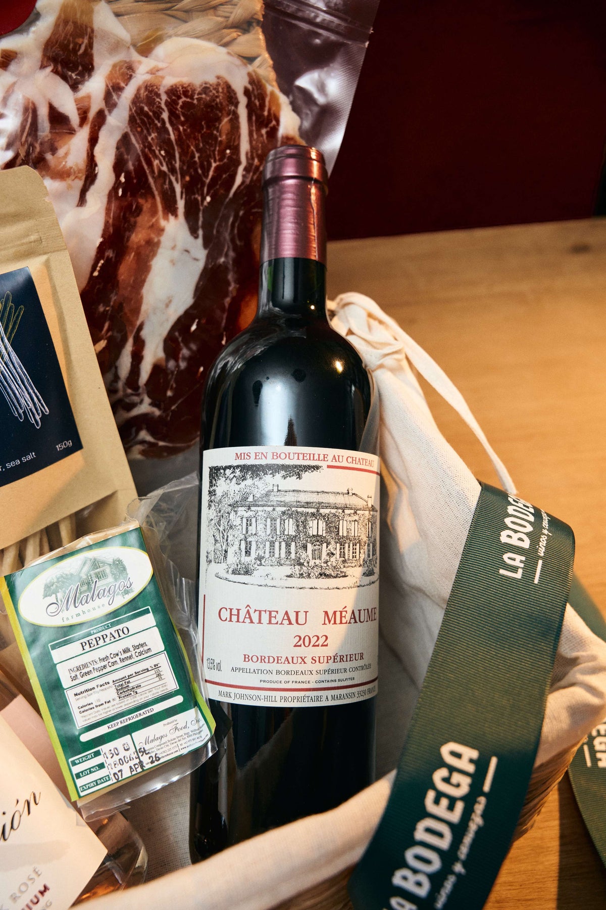 Set includes: Murviedro Expresión Pink Rose, Château Méaume Bordeaux Supérieur, Malagos Peppato Cheese, Jamon Brothers Jamon Serrano 100g, Vegan Grissini